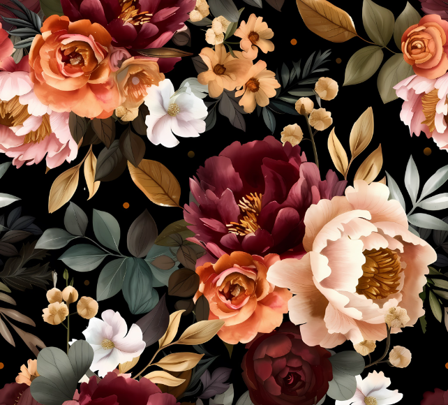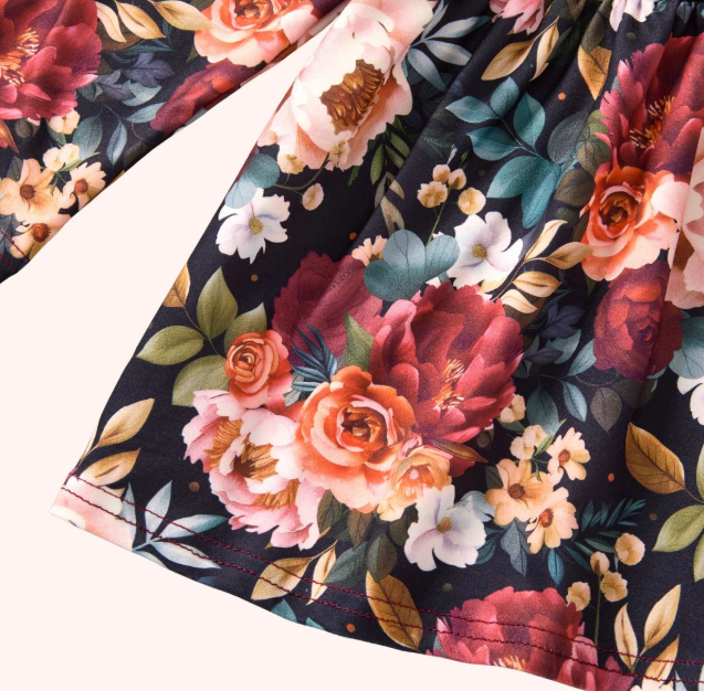 This gorgeous Mulberry Garden 2-piece set is pure magic for your little princess! From our exclusive Mulberry Collection, it features a beautiful long sleeve peplum top with rich burgundy peonies, soft peach roses, delicate white blossoms, and golden leaves dancing across a midnight black canvas. Paired with coordinating solid burgundy leggings for the perfect sophisticated look. Your little garden princess will feel like royalty in this enchanting floral masterpiece!
