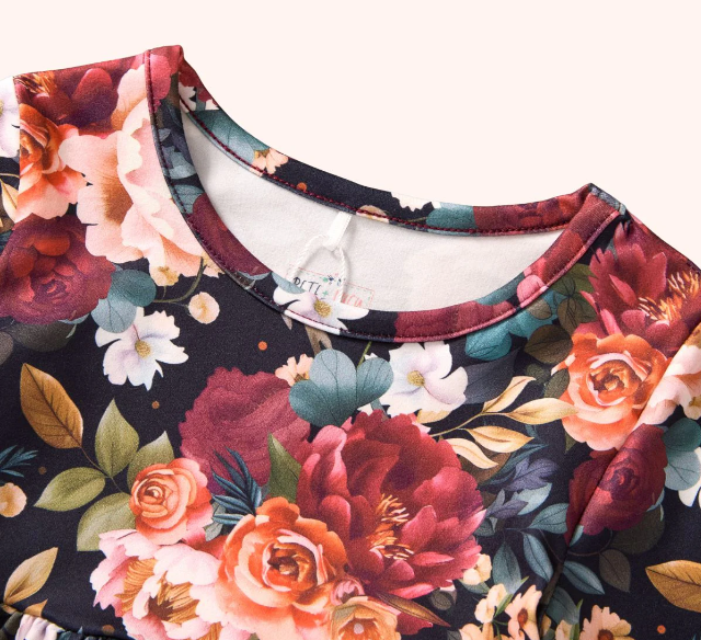 This absolutely stunning long sleeve dress romper is like wearing a piece of art! From our exclusive Mulberry Collection, it features a magnificent floral garden with rich burgundy peonies, soft peach roses, delicate white blossoms, and golden leaves dancing across a midnight black canvas. The luxurious burgundy trim and snap closure make this piece as practical as it is beautiful. Your little one will look like a precious garden fairy in this absolutely gorgeous piece!