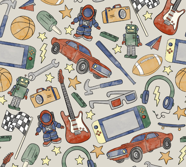 This adorable one-of-a-kind long sleeve pants romper is perfect for your little explorer! Featuring a fun toy-themed print with basketballs, cameras, stars, and playful doodles scattered across cream sleeves and leg cuffs, paired with a solid sage green body and matching chest pocket. It's like wearing a treasure chest of childhood fun! Perfect for playtime, photo sessions, or everyday adventures! Your little one will be comfortable and stylish while exploring their world, and you'll love the quality construction and adorable details!